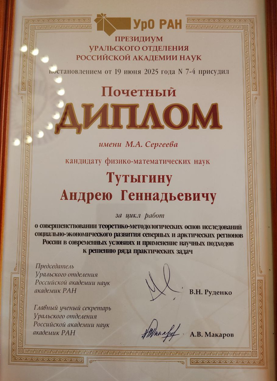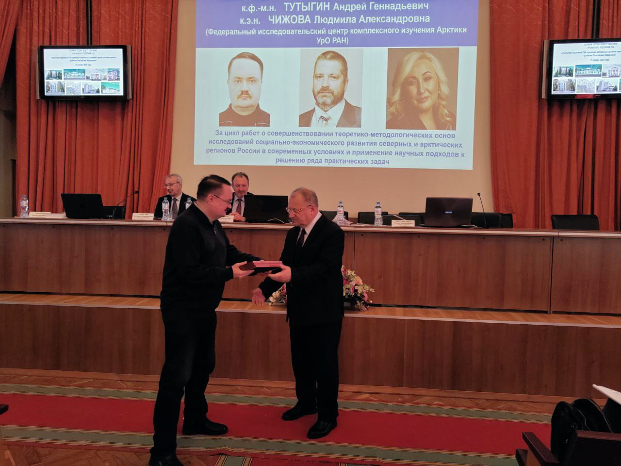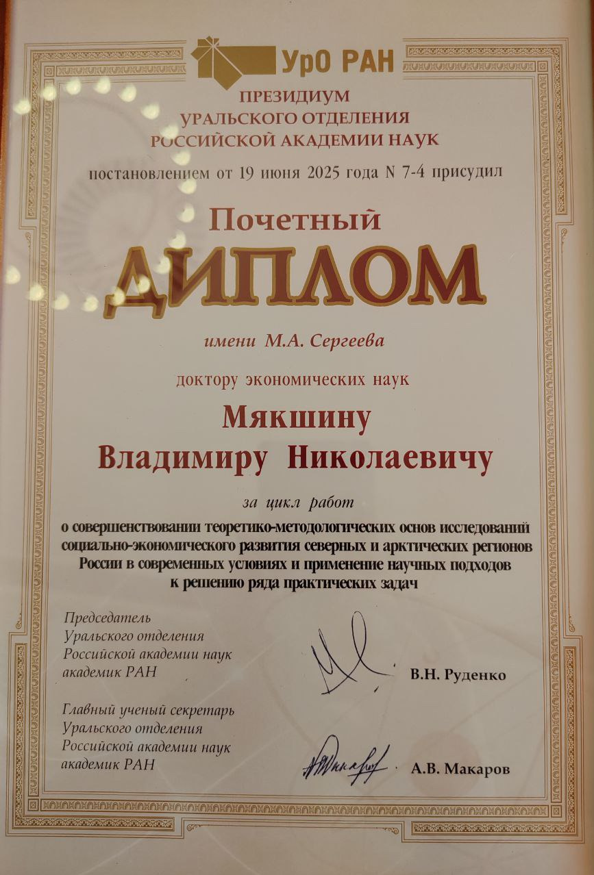 Почётных дипломов имени М.А. Сергеева удостоились заведующий лабораторией социо-эколого-экономических систем, доктор экономических наук Владимир Николаевич Мякшин; заведующая лабораторией проблем развития территорий, кандидат экономических наук Людмила Александровна Чижова и ведущий научный сотрудник лаборатории проблем развития территорий, кандидат физико-математических наук Андрей Геннадьевич Тутыгин. Награда присуждена за цикл работ о совершенствовании теоретико-методологических основ исследований социально-экономического развития северных и арктических регионов России в современных условиях и применение научных подходов к решению ряда практических задач.