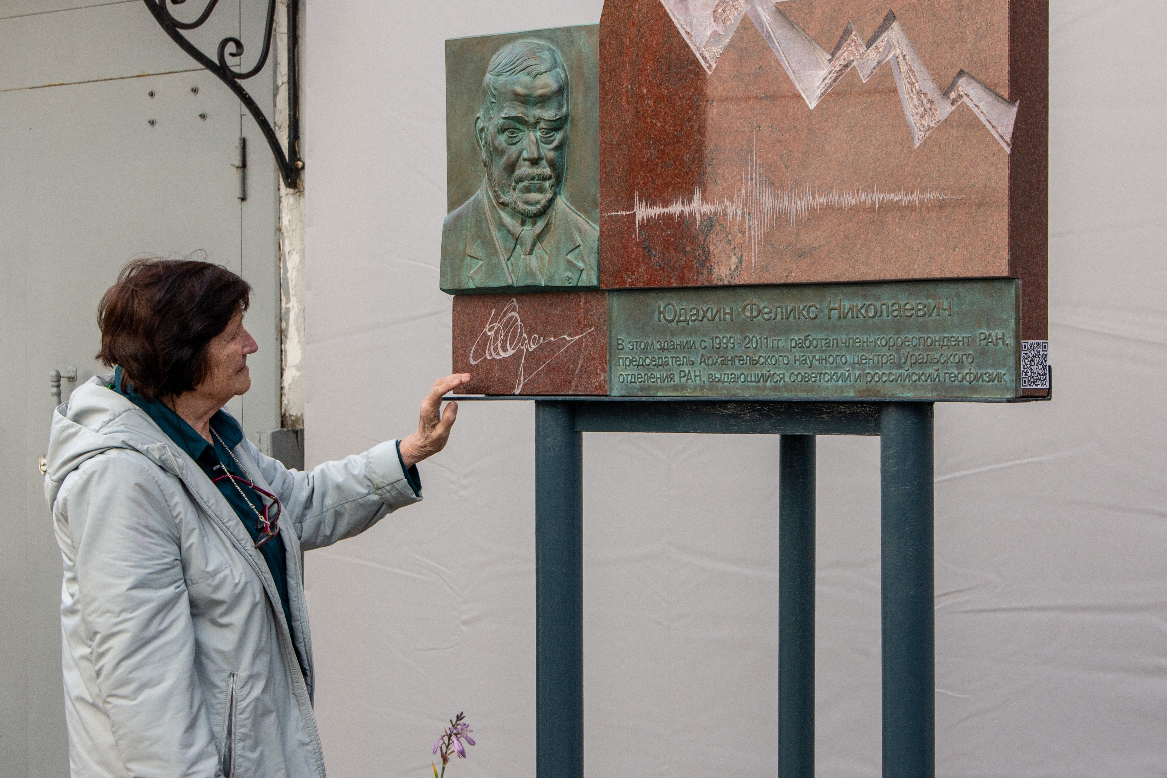 В верхней правой части мемориальной доски изображен ломаный силуэт горной гряды Тянь-Шаня, символизирующий годы работы чл.-корр. РАН Ф.Н. Юдахина в Киргизии. Под силуэтом горной гряды выгравирована волновая форма землетрясения, зарегистрированная сейсмической станцией «Климовская», входящая в состав Архангельской сейсмической сети. С сейсмической станции «Климовская», основанной чл.-корр. РАН Ф.Н. Юдахиным в 2003 г. при содействии вице-президента РАН, академика РАН Н.П. Лавёрова, началось развитие сети сейсмических наблюдений в Архангельской области. За время работы Ф.Н. Юдахина в регионе было открыто 7 сейсмических станций, заложены основы сейсмического мониторинга Европейского сектора Арктики.