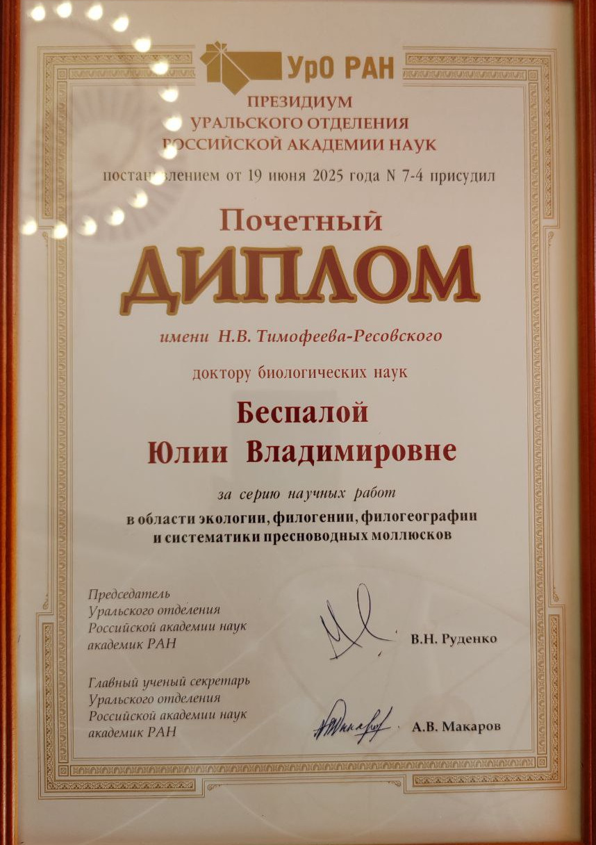 Почётный диплом имени Н.В. Тимофеева-Ресовского был вручен директору Института биогеографии и генетических ресурсов ФИЦКИА УрО РАН, доктору биологических наук Юлии Владимировне Беспалой. Награда присуждена за серию научных работ в области экологии, филогении, филогеографии и систематики пресноводных моллюсков. Юлия Владимировна также представила на Президиуме УрО РАН доклад по теме исследования.