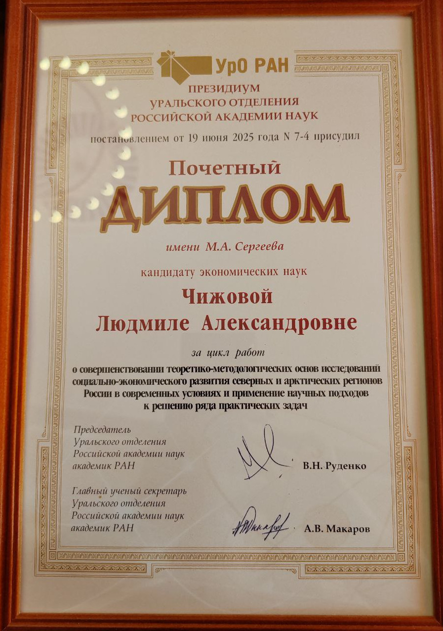Почётных дипломов имени М.А. Сергеева удостоились заведующий лабораторией социо-эколого-экономических систем, доктор экономических наук Владимир Николаевич Мякшин; заведующая лабораторией проблем развития территорий, кандидат экономических наук Людмила Александровна Чижова и ведущий научный сотрудник лаборатории проблем развития территорий, кандидат физико-математических наук Андрей Геннадьевич Тутыгин. Награда присуждена за цикл работ о совершенствовании теоретико-методологических основ исследований социально-экономического развития северных и арктических регионов России в современных условиях и применение научных подходов к решению ряда практических задач.